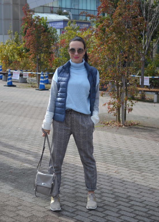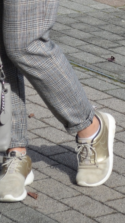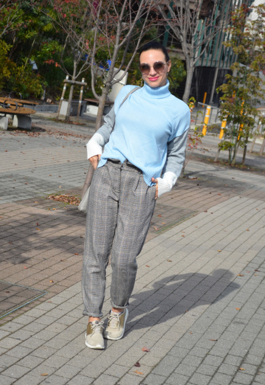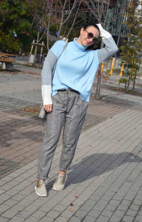 свитер с брюками вполне симпатичные! в образах мне честно режут глаз золотые кроссовки, они из теплой гаммы, а комплект холодный, вот белые бы подошли отлично бы!