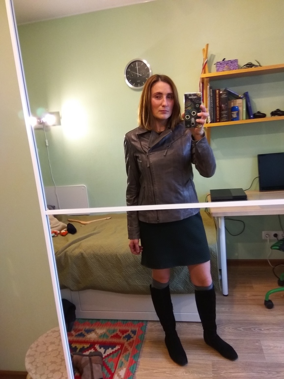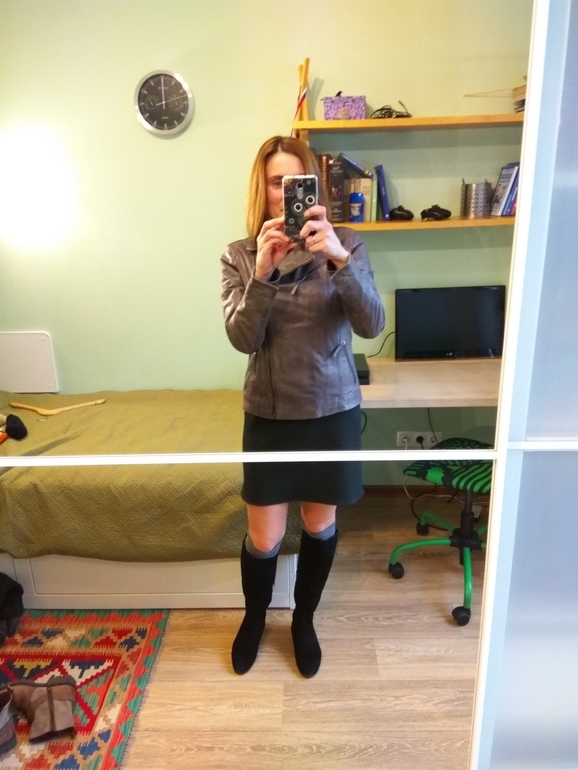 Курточка классная, но вот с платьем смущает, как будто на равные пропорции режет фигуру. Может подлиннее юбку-карандаш?