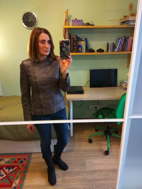 Сзади нет воротника)) Уже выгуливаю со штанами под лак и ботинками соответствующими..Только макияж добавить и как с рок-фестиваля мать))