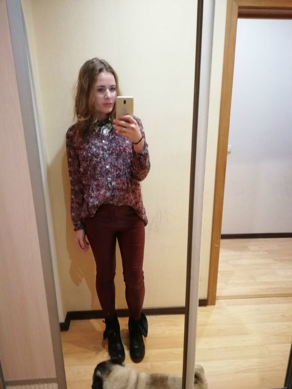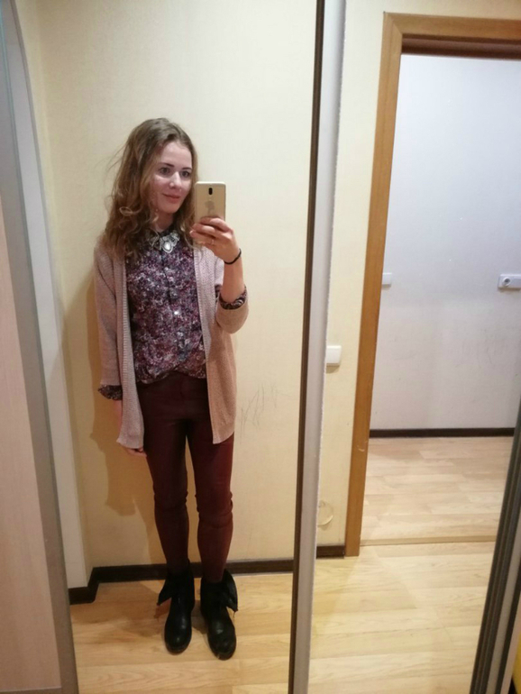 ну и образ с обновками- невероятно удобные брючки кожзам для повседневных прогулок, кардиган для тепла, рубашка в цветочек (я решилась на него), колье
