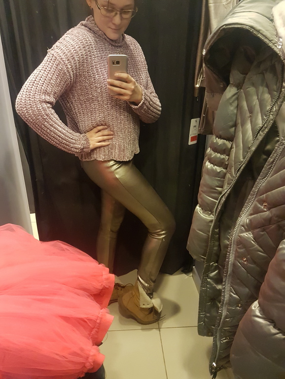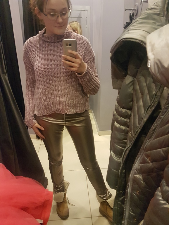 Есть под эти штаны у меня и рубашки длинные и свитера длинные, блестяшка будет в тему.
