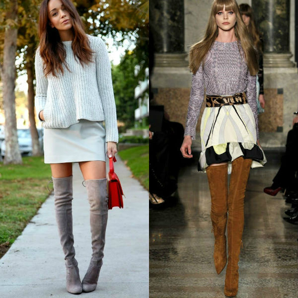 Если у вас нет сапог-чулок, подойдут любые высокие сапоги с узким голенищем, если под них надеть высокие шерстяные чулки в тон. Тоже визуально удлинят и вытянут ноги.