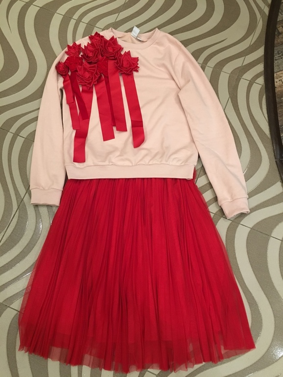 Купила я свитшот, очень мне понравился, розы из лент и бархата на бежевом, красивое сочетание, начала судорожно под него искать юбку, в голове знала,что хотела и практически быстро справилась с этой задачей . И на скорую руку, еще с этой юбкой пару фото.