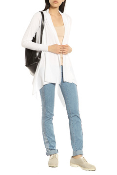 ПосоветуйтеУсиленно ищу на лето кардиганы с хорошим составом (хлопок+немного шерсти или кашемира или шелк+кашемир....). Хочу купить нескольких цветов - белый, черный, и какой-нибудь светлый, м.б. светло-розовый или светло-беж....Найти сложно, и то что нашла, имеет не ровные края, а треугольные (фото ниже).