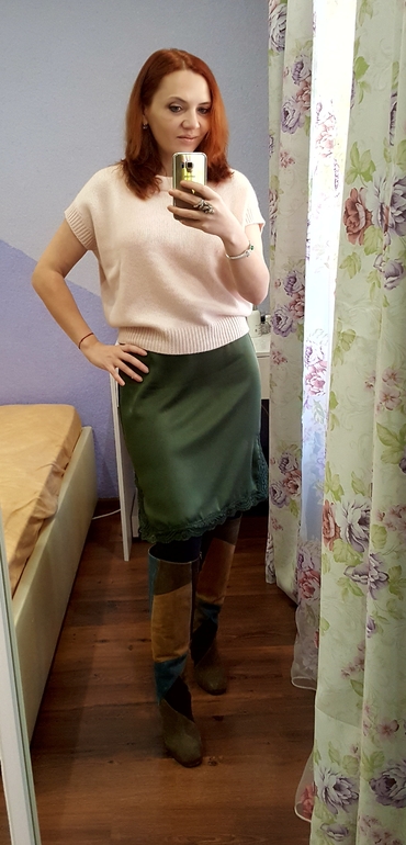 Свитер и сапоги хорошие. Но с юбкой этой вообще никак... Странный образ получился.