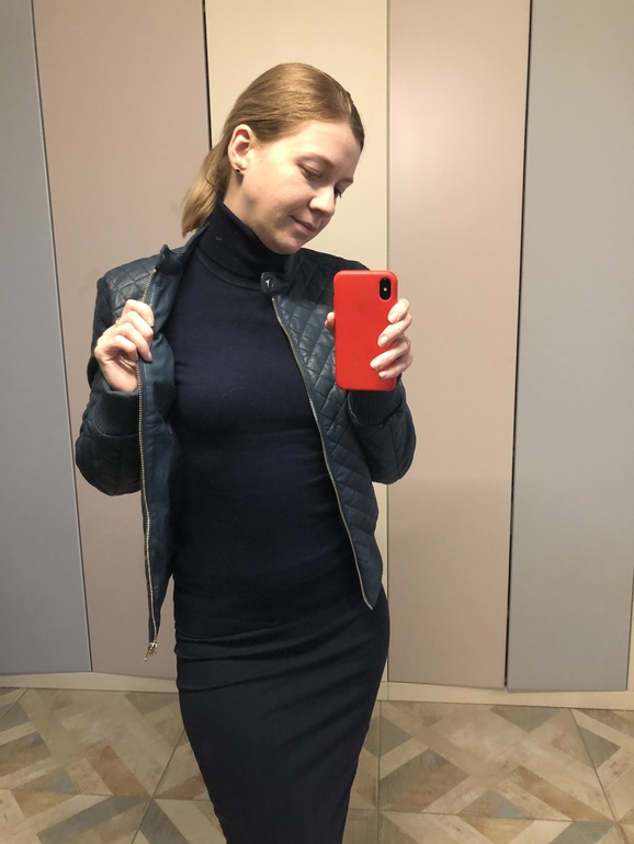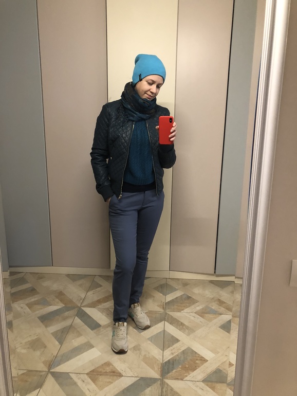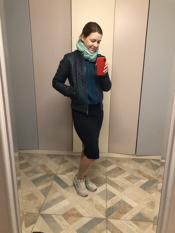 С курткой на фото кажется вполне ничего, а в реальности мне не очень. Она немного утепленная, с вязанными манжетами. Юбка мятая, я в процессе сборки.