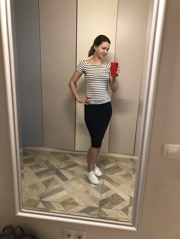 Меняю юбку. Трикотажная, темно-синяя, в ней свободно и легко передвигаться, подойдет и для городских прогулок и для мероприятий на борту.