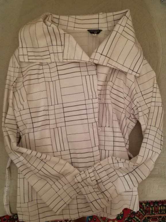 А мне кажется, что она вам мала минимум на размер. Если бы она сидела свободно, как задумана, ее по стилю можно было бы отлично сочетать с джинсами клеш)