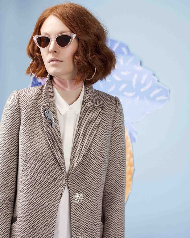 Пальто вот в такую вот ёлку и такого цвета. Довольно большой отложной воротник.