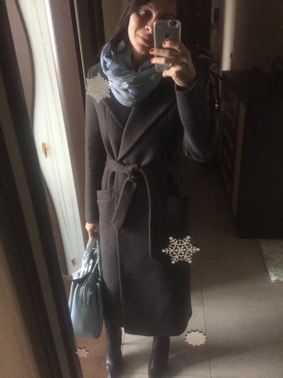 Длина конечно швах, можно чуть ниже колен подшить, но не велико ли,? Размер 40-42. И не мрачно? Я купила шарф и сумку на весну, планирую яркую брошь. Буду носить с сапожкамиина каблуке.