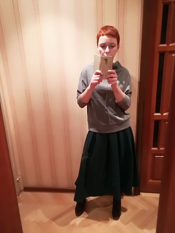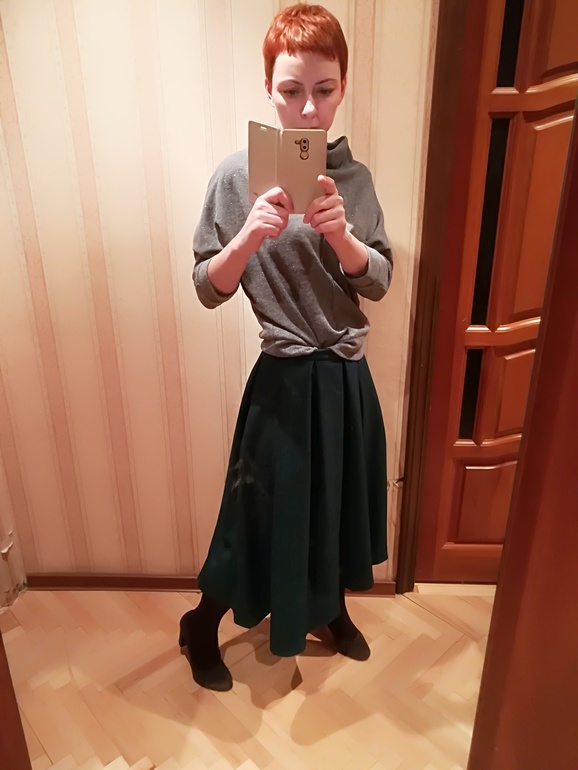 вот хочется эту юбку на Вас натянуть выше, прям сильно выше, сантиметров на 7..... то ли фото такие сверху вниз, то ли что, но пропорции явно нарушены, ощущение, что торс очень длинный. Если говорить о сочетании, то понравился только вариант с водолазкой. Сочетание такой юбки со спортивными вещами не понравилось.