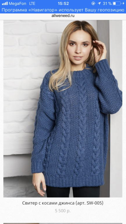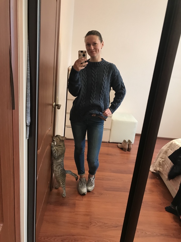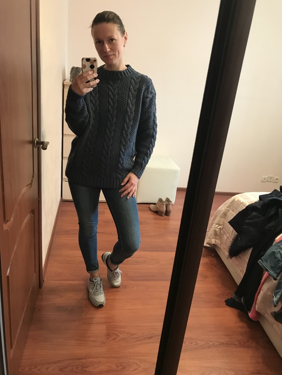 Я там ниже писала. Они безумно комфортный, обнимательный. Мягкий, но не рыхлый. И он совпал с моим внутренним представлением об «идеальном свитере с косами»))