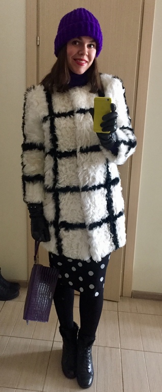 По мне перебор, много акцентов. Пальто с юбкой неплохо, но шапка не из этой "оперы") и ботинки тоже, нужно что то поизящнее.