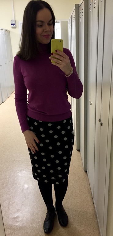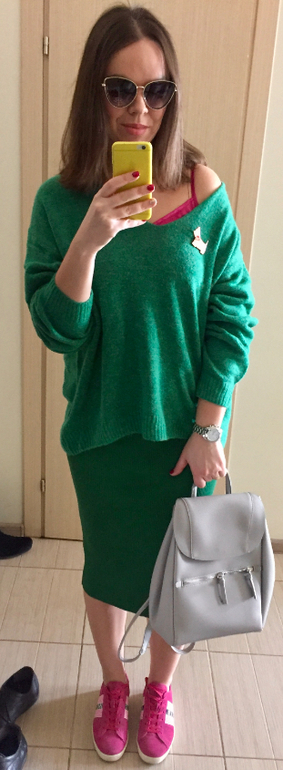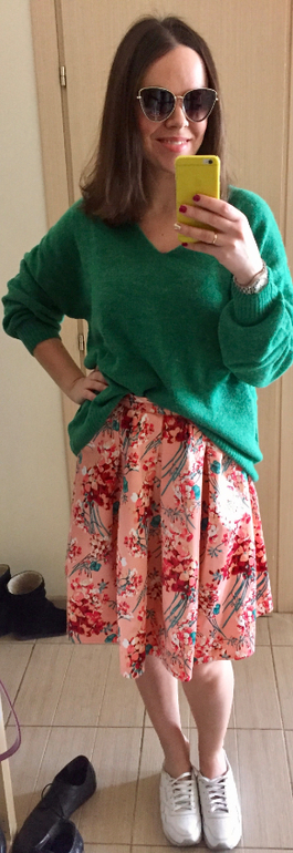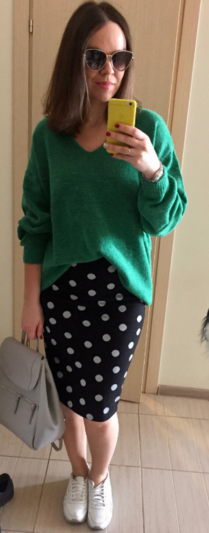 Все супер! Единственное 4-е сочетание для меня спорно. А какой состав у свитера? Очки, мне кажется, Вам идут. И рабочий образ нравится, но с зелёным свитером больше нравится юбка в горох :)