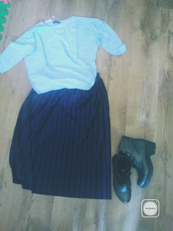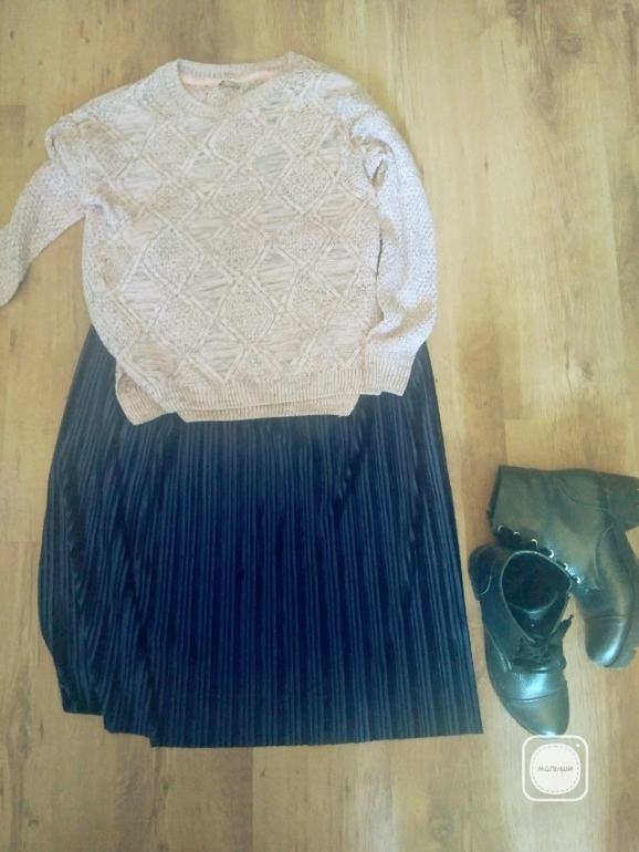 Сложно определить...Все лежит на полу и выглядит объемным. Свитер+ботинки сочетаются, вопрос в юбке, какого она фасона и как сидит. Смотрите чтобы одежда не увеличивала вас на 2 размера.