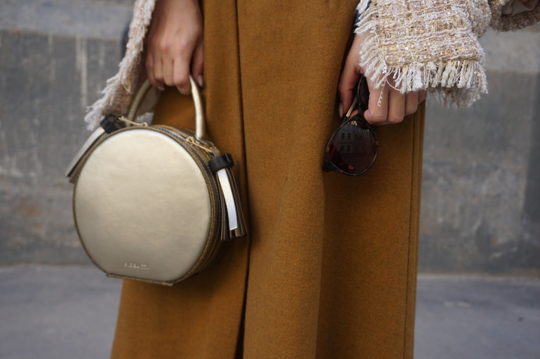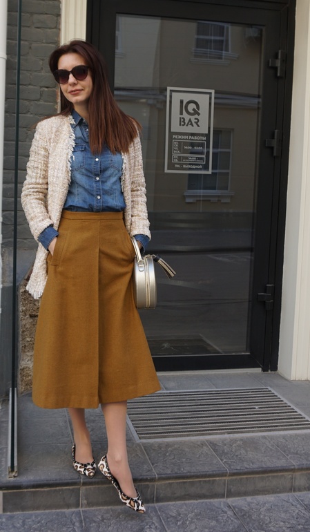 чем-то похоже на моду азиаток :) Они обожают подобные юбочки, именно такой длины и цвет охры тоже очень часто на них встречается! Но мягкости и славянскости придают твоему образу жакет (азиаток в таких не видела) и круглая сумочка! Причем, круглые сумки носят и азиатка, но без кисточек сверху :)