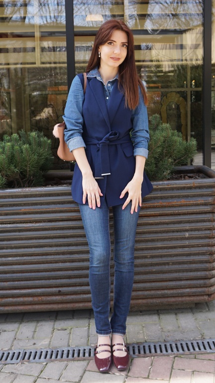 Идея стилиста была такая - актуальный тренд на тотал джинс разбавить элементами женственности - жилетом и обувью.