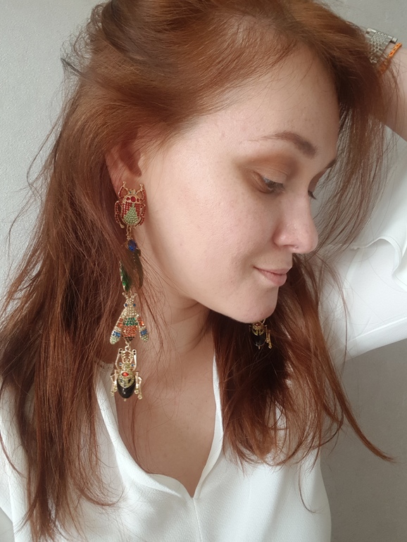 а серьги очень интересные! я бы расцепила и носила по 1 жуку в ухо и еще брошек намастерила из остатков))