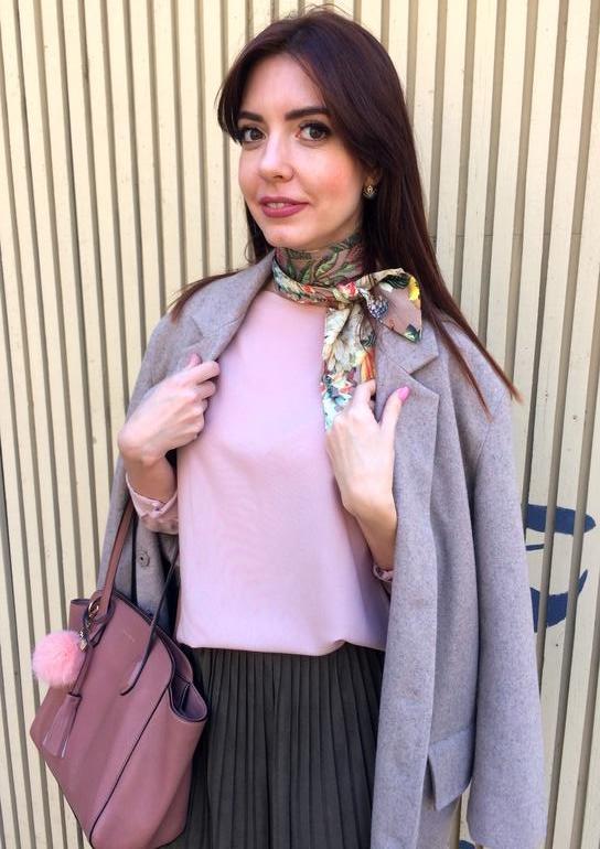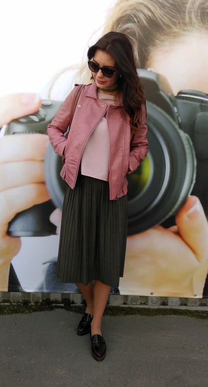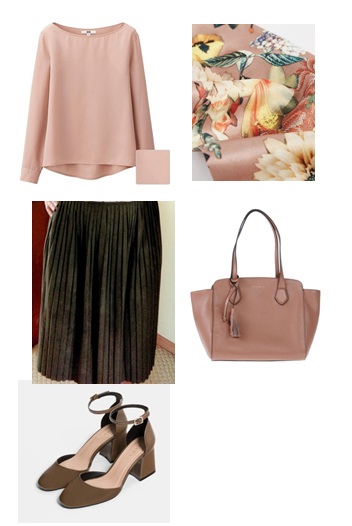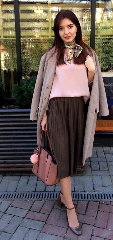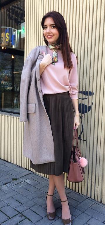 Блуза - пыльный розовый, юбка и туфли - хаки.