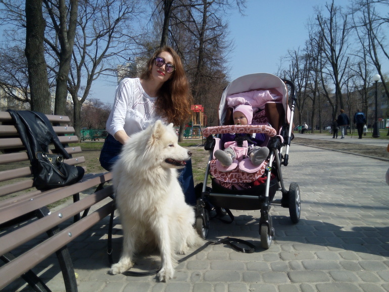 Юбочка светленькая, кофточка светленькая, поэтому и просится на ноги светлое что то ))) ой мне очень нравятся самоеды. Про характер не знаю, но такиииие пушистые 😁но представляю какой уход за шерстью!