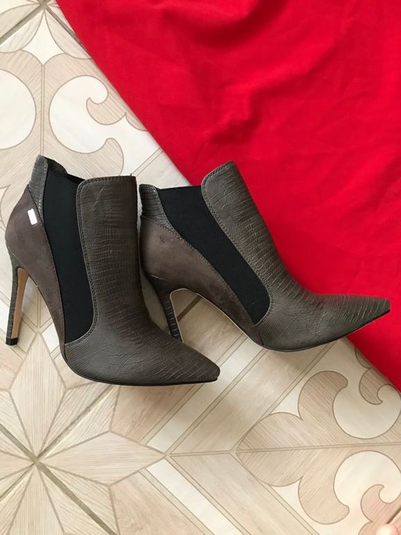 А зачем вообще ботильоны? Весна вроде. Платье без рукава, подразумевается что летнее. Туфли сюда надо. Чёрные, серые, бежевые...