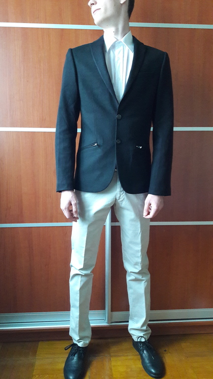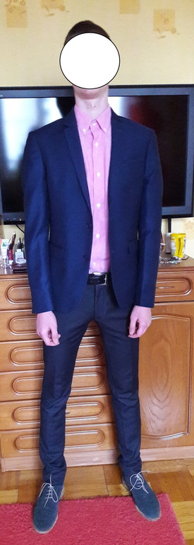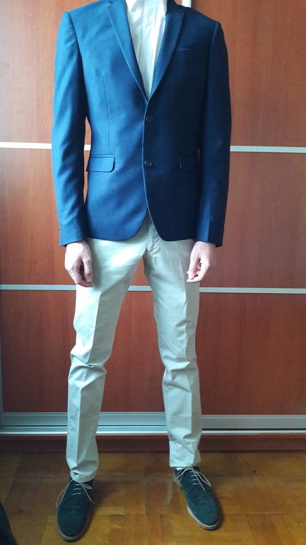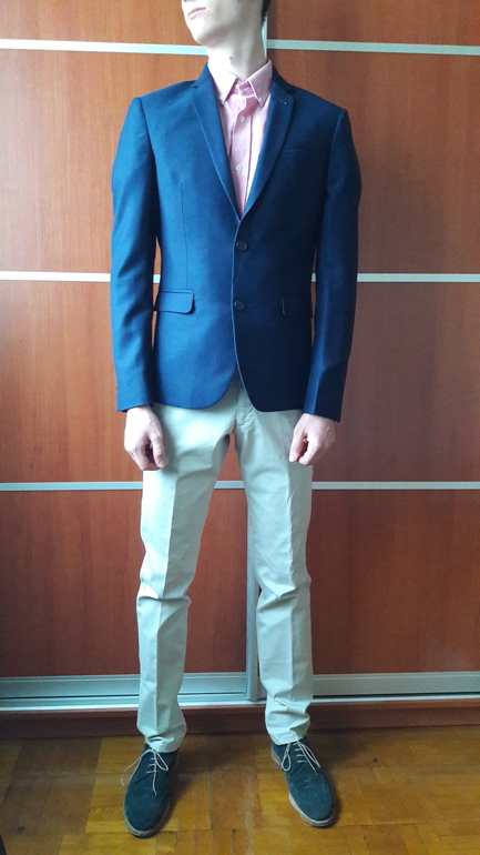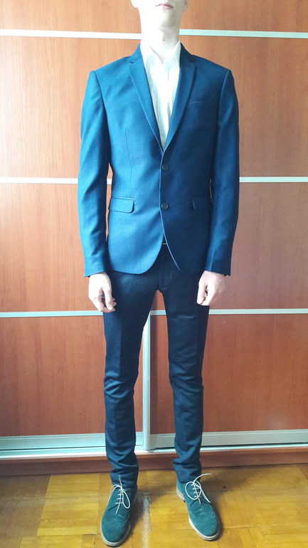 1/ Итак, вариант 1: синие замшевые ботинки, темно-синий пиджак и брюки, белая рубашка.
