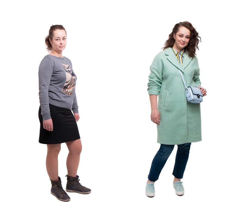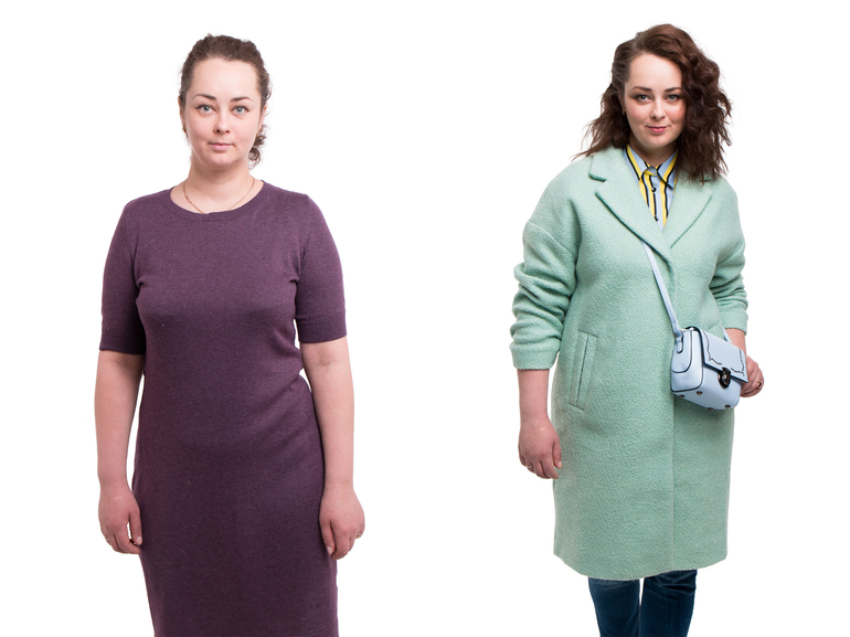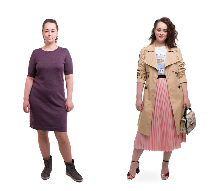 На фото "ДО" (так клиент ходит на работу) видно, что талия есть. Но подчеркивать ее нужно аккуратно, чтобы при этом не сфокусировать внимание на особенностях в области живота.