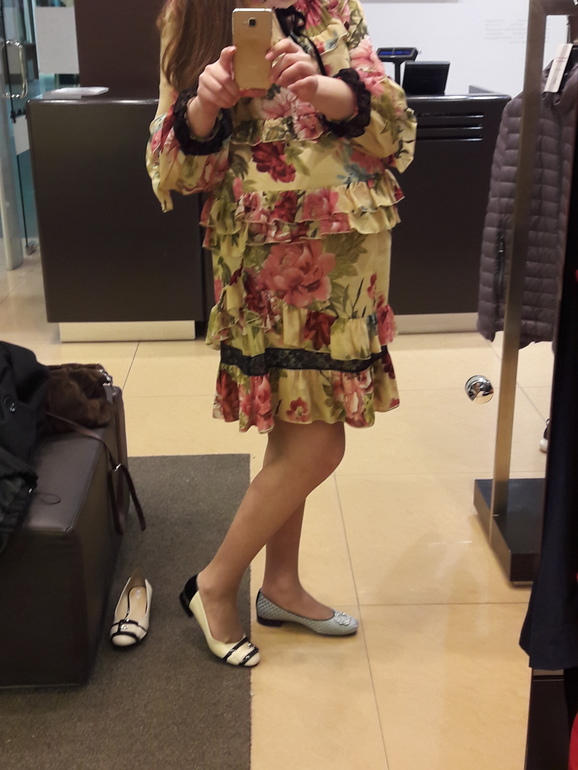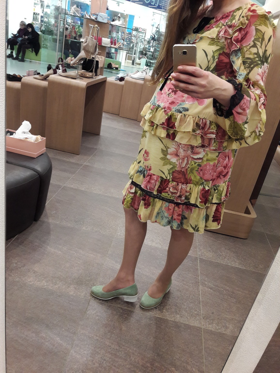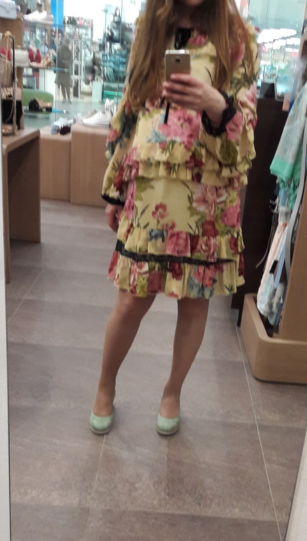 Фотограф из меня просто никакой! Розовые примеряла, не вариант((Бирюзовые к нему больше всего подходят, там цветы на пузе именно такого оттенка. В каталоге это платье вообще с серыми батильонами было, с черными замша тоже хорошо( сейчас ношу, там на платье черная отделка из замши и кружево), но на лето надо посветлее. Бордо как- то не рассматривала, мысль! Спасибо!