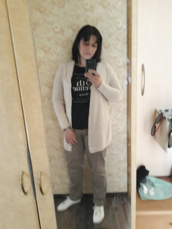 Все брюки и джинсы старайтесь покупать с высокой талией, благо этого сейчас много. К футболке и кардигану претензий нет) единственное что чёрный я бы рекомендовала вам избегать.