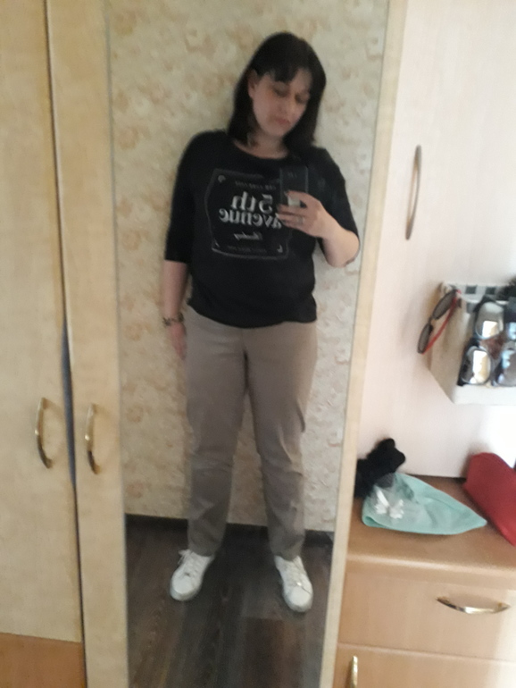 К сожалению все трикотажные кофты нужно сжечь( видно "навес" над линией, где брюки впиваются в талию. Зачем оно вам? Только портить фигуру( дело не в брюках, а в трикотажной кофточке, а брюки пусть еще пару кг подождут и носите спокойно