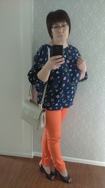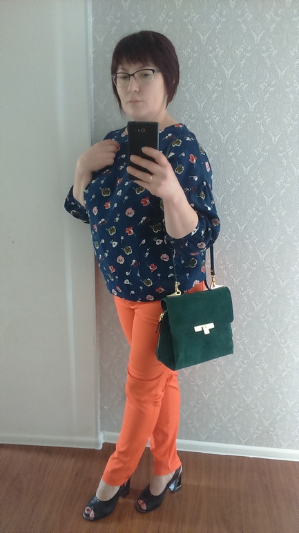 Вот то что пиджак сразу с тебя размер снимает вверху факт. А так если не иметь цели выглядеть стройнее мне вполне и первый комплект нравится и я вижу что цветочки и с брюками перекликаются и с сумкой зеленой :)))