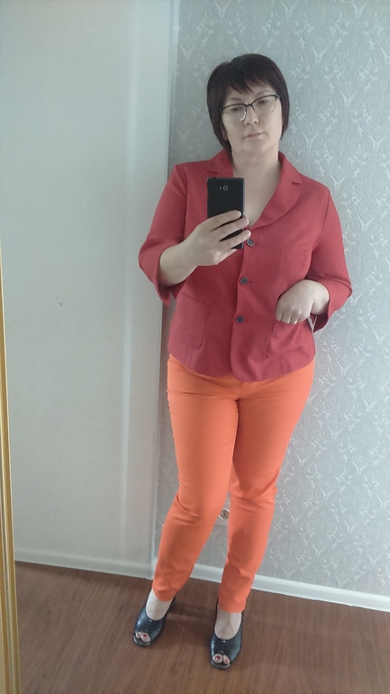 Брюки оранж явно малы. Жакет какой-то короткий.