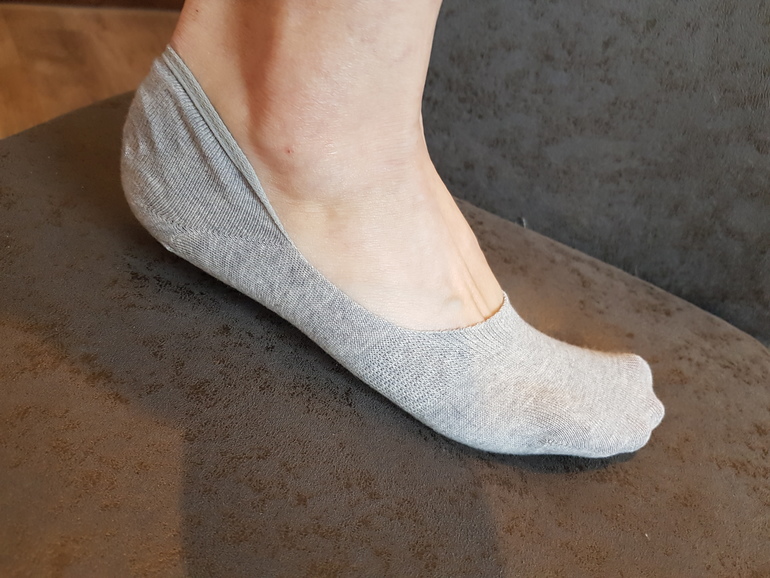 Вот так сидит на ноге. На пятке это не завернулось, там такой край. А складки это вставки немного выпирают. Еще видела там следки под балетки, у них нет бокового края. Т.е. пятка и носок соединяются полоской по стопе. Вдруг кому актуально будет )