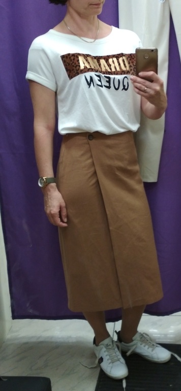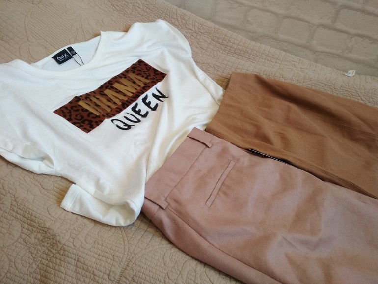 Это все купила сегодня в Фамилии. Брюки Massimo 65% лен и 35% полиамид, 1400руб. Юбка Emka , лен и хлопок, 1100руб. Футболка Only 360руб.