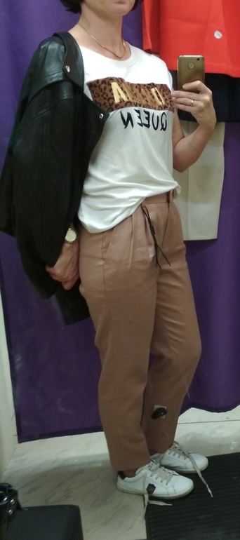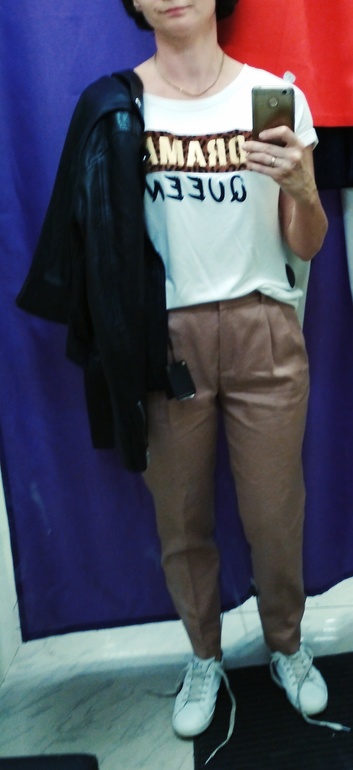 В этом пришла, но тоже все из Фамилии. Комбез Motivi за 500руб был куплен. Кеды за 700руб. Натуральная кожаная косуха за 2500руб. Купила ее случайно, для корпоратива в стиле ГламРок. В итоге не вылезаю! Незаменимая вещь в моем гардеробе! Плащ Massimo ни разу не одела из-за нее. ))))