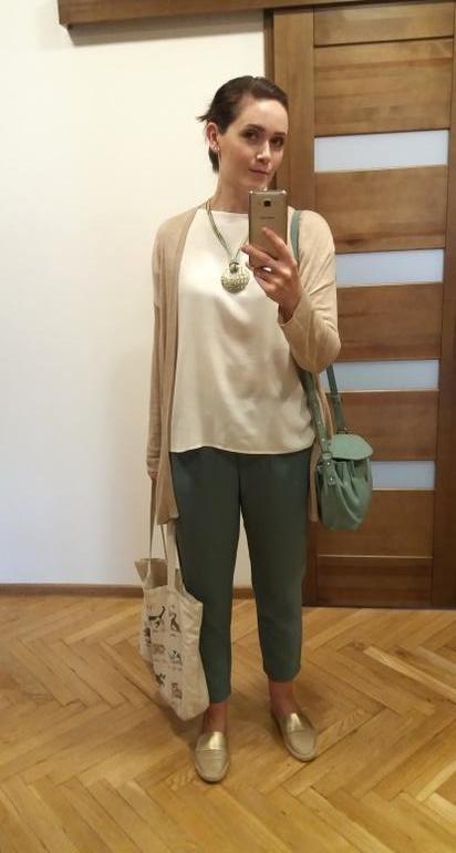 Блузка вискоза молочного цвета, сшита на заказ, кардиган "H&M", сумка "Экко" (расстанусь, когда полысеет совсем никогда), ну и чего уж там - золотые тапки. )))