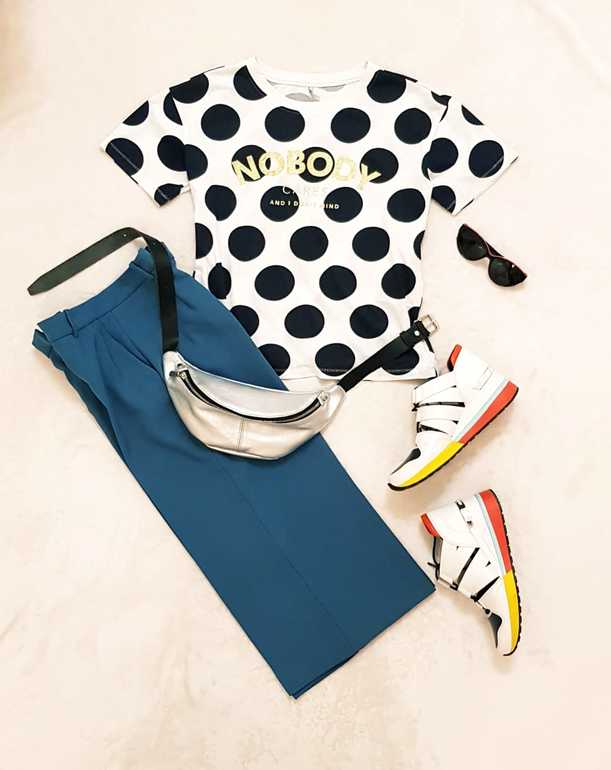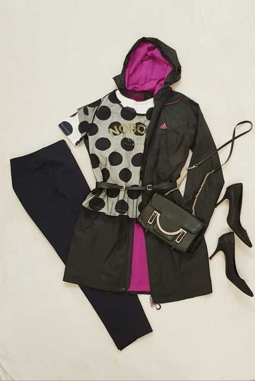 3 образ - тут захотелось сделать микс со спортом, поэтому в качестве верхней одежды выбрала ветровку Adidas. Сетку стащила от другой футболки и надела на горошек) Таким образом футболка вполне вписалась в "вечерний" вариант.