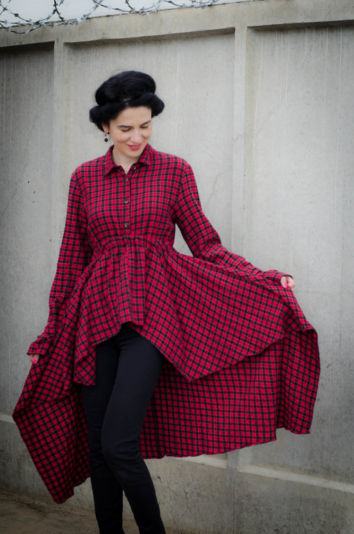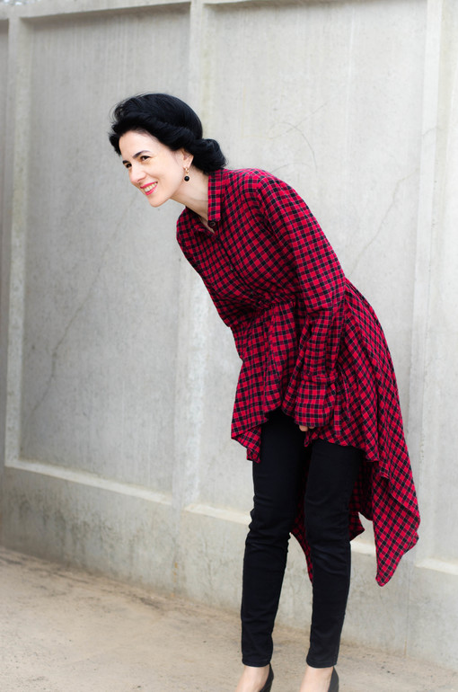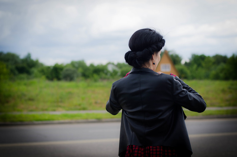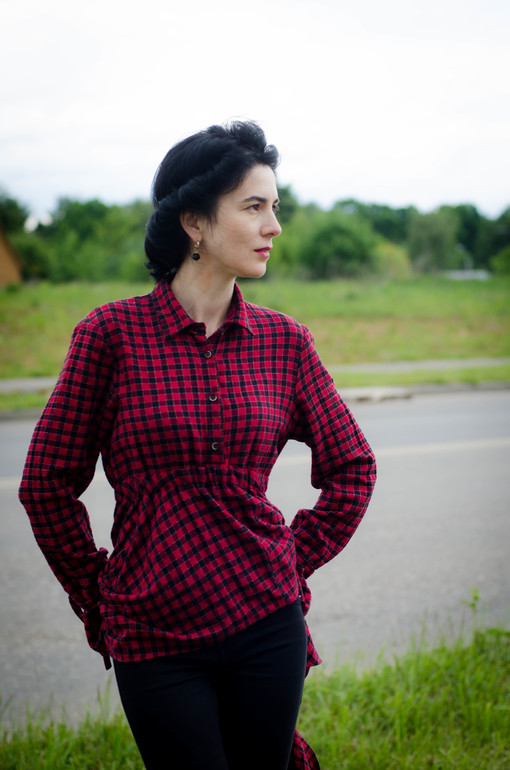 Но, на мой взгляд, вместо лодочек лучше бы грубые ботинки и прическу менее строгую, возможно небрежный низкий хвост, завязанный небольшим платком