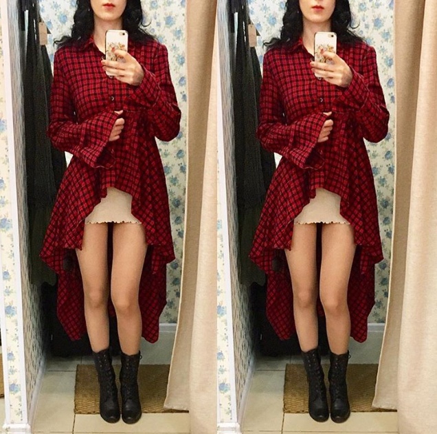 А в примерочной было так. На осень надо придумать образ с юбкой.