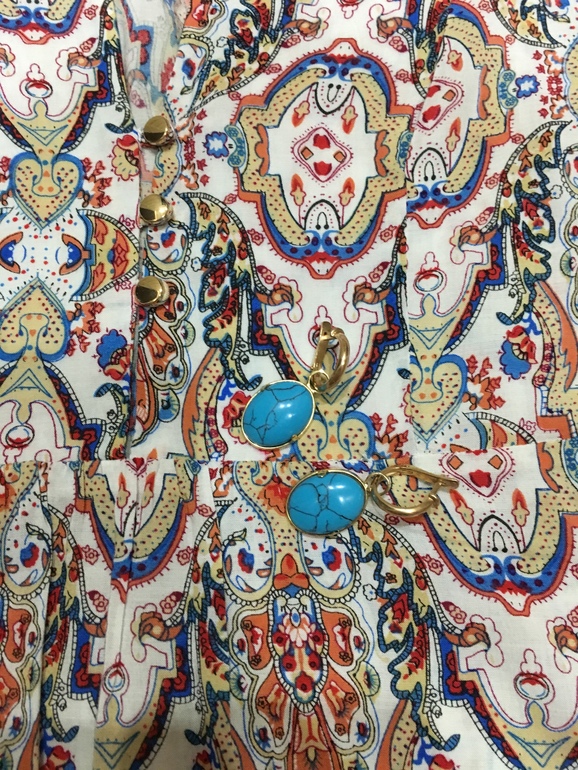 Есть у меня две блузки из магазина «Лайм». Ооочень их люблю. Прям под многое они подходят. Вот блузка вблизи. И серьги бирюза. Очень сочетается