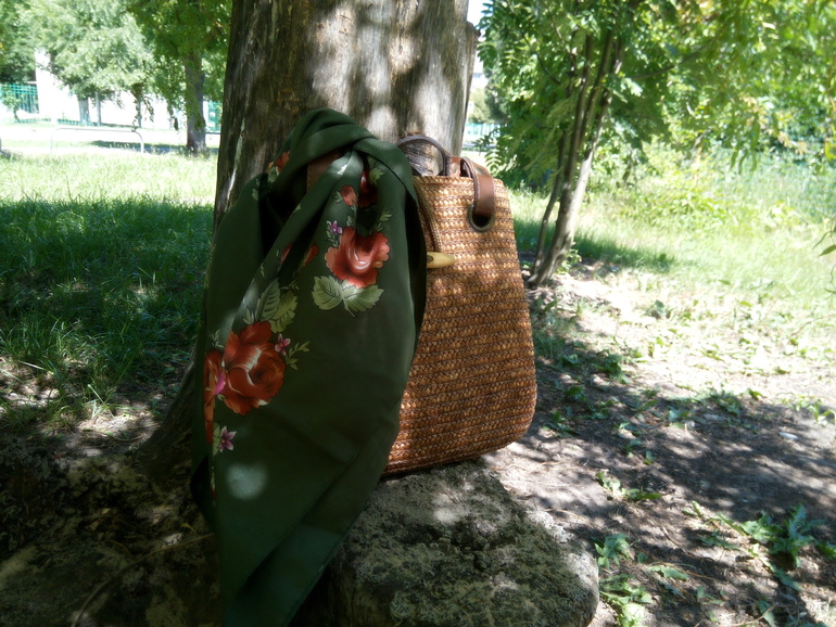 Этот платок не повязывайте на сумку. Нелепо смотрится. Туда нужен легкий, шелковый, например.