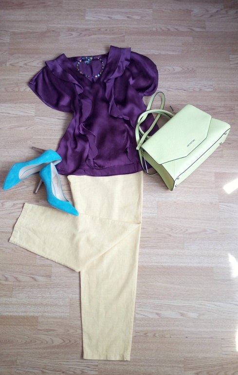 У меня ярко-желтая сумка. Ношу с ярким бирюзово -голубым топом, белыми брюками.