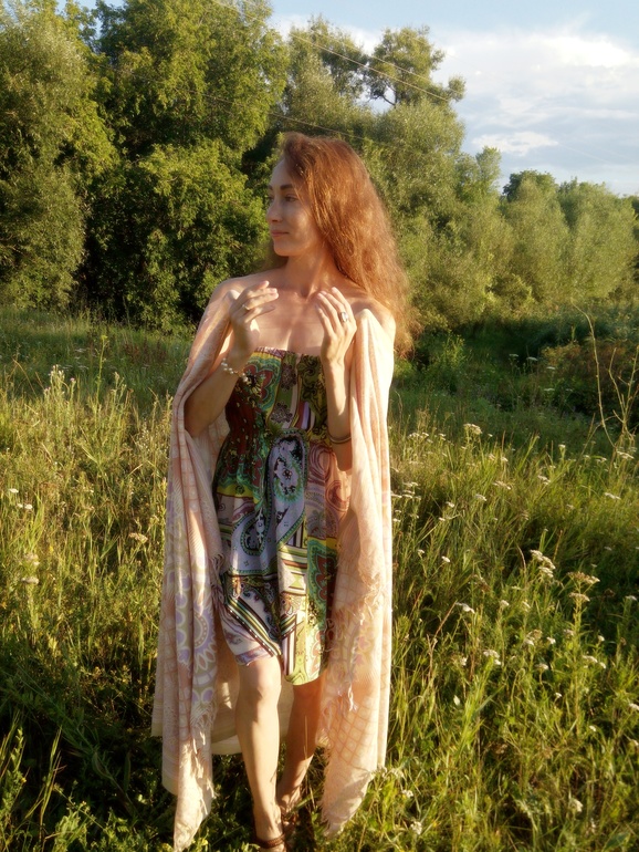 А идея с этим платком заключалась в намотке на шее. И так красиво я его намотала, что самой понравилось)) но ребёнок залез в телефон и стер полгалереи. Так что, верьте на слово))