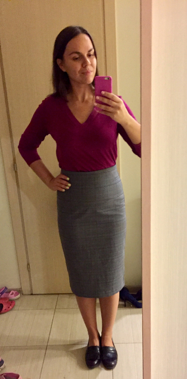 юбка отличная офисно-деловая ) с рубашкой и лодочками прям я тащусь всегда от таких нарядов ) когда чувствуешь себя секси в юбке-карандаш )) иногда прям скучаю по такому стилю ))) голубая рубашка еще будет хорошо и лодочки цветные можно попробовать