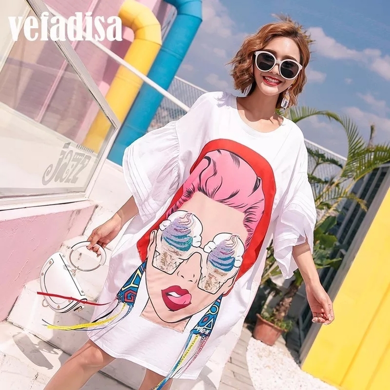 Vefadisa 2018 Лето Для женщин мультфильм блесток платье принт асимметричные платья свободные Повседневное кисточкой Нерегулярные футболка платье A097