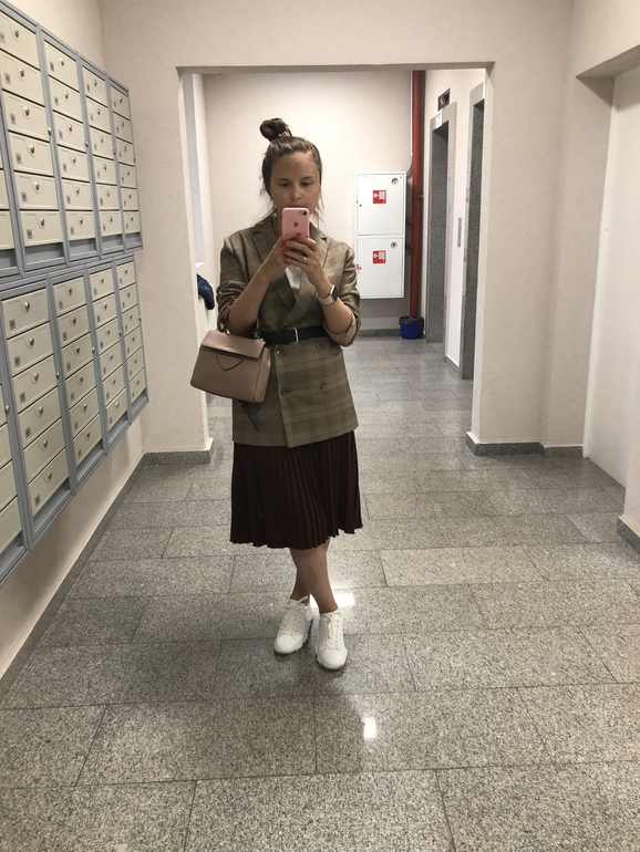 Мне нравится!современно,рукава закатаны,пиджак,юбка,ремень,белые кроссовки-прямо по-блогерски))))