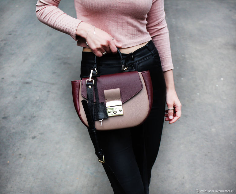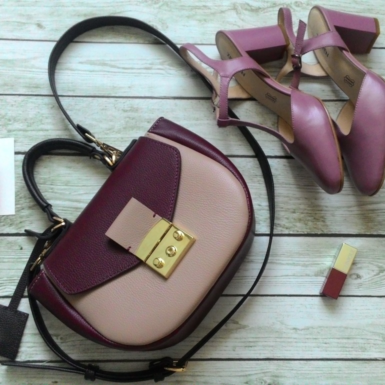 Сумочка небольшая,цвет на фото невозможно передать:бордо,черный и беж пудра-пыльная роза.Туфельки намного бледнее в реале,чем на фото