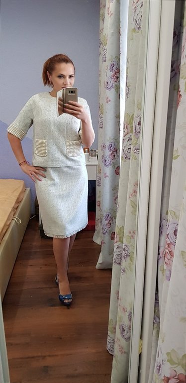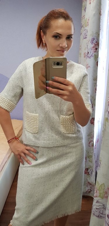 И купила костюм на работу. Продается всё отдельно, есть ещё юбки, но я взяла так. Качество замечательное, все на подкладе. Ткань на фото плохо видна и снять близкую к реале так и не получилось.