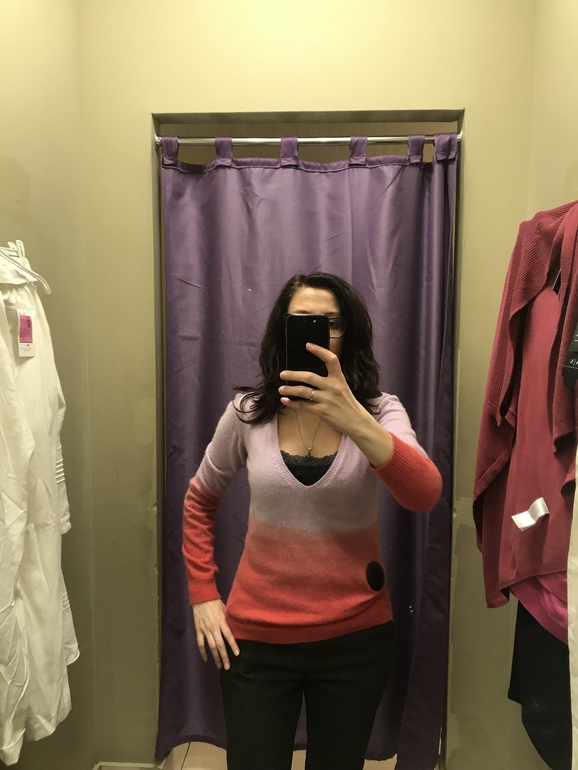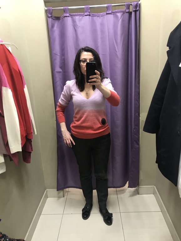 Я бы сдала обратно, если еще не поздно. Свитер вас не красит, зрительно фигуру пополам режет.