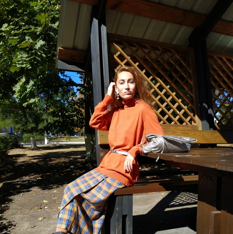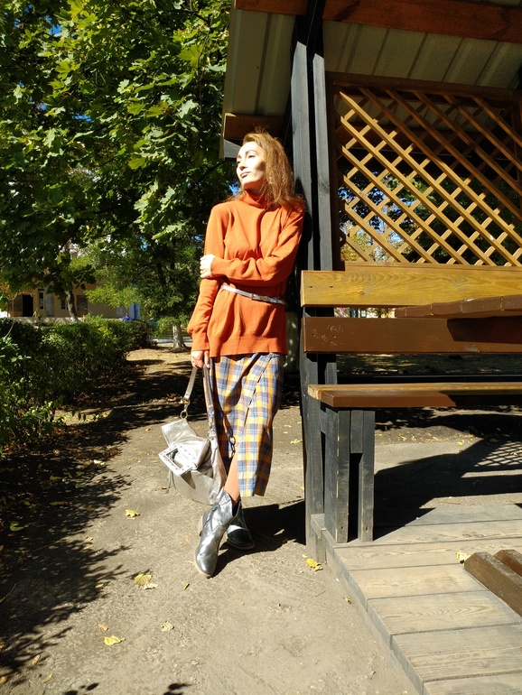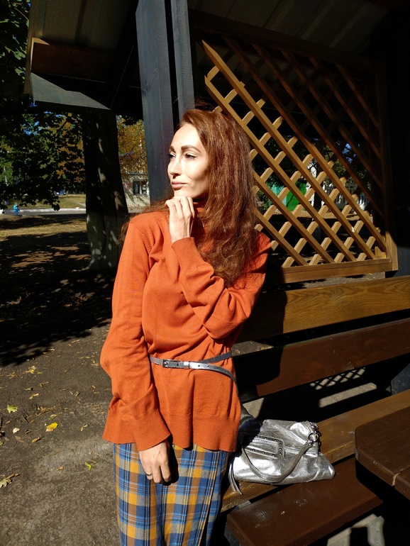 На прогулкеОсень люблю, пожалуй, только за уютные краски. Винный, бутылочно-зеленый, охра, оранжевый, коричневый - любимые цвета в осеннем гардеробе.